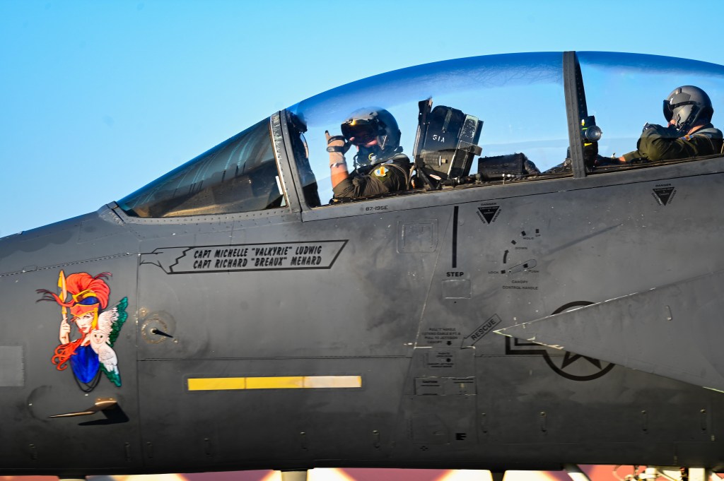 An F-15E Strike Eagle pilot gestures before takeoff during Bamboo Eagle 24-3 at Travis Air Force Base, California, Aug. 5, 2024. Bamboo Eagle 24-3 provides Airmen, allies and partners a flexible, combat-representative, multidimensional battlespace to conduct testing, tactics, development, and advanced training. (U.S. Air Force photo by Capt. Benjamin Aronson)
