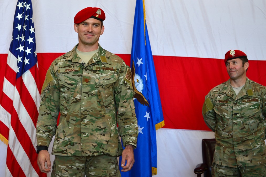Then U.S. Air Force Maj. Michael Jensen, 26th Special Tactics Squadron commander smiles after assuming command of the squadron in 2014. (U.S. Air Force photo/ Senior Airman Eboni Reece)