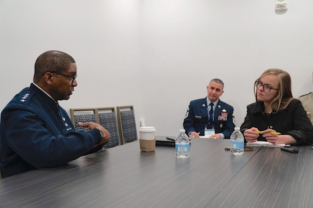 Gen. Randall Reed briefs DefenseScoop's Brandi Vincent at Sea-Air-Space 2025. (Photo source: U.S. Transportation Command)