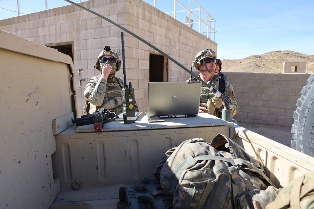 FORT IRWIN, Calif. – Bravo Company (Bandits), 11th Cyber Battalion, culminated months of home station training with participation in National Training Center Rotation 25-03, January and February 2025. Expeditionary CEMA (Cyber and Electromagnetic Activities) Team 05 and ECT 06, B Co., 11CB, conducted electromagnetic reconnaissance, radio frequency enabled offensive cyber operations, and special purpose electromagnetic attacks to shape operations during the rotation for III Armor Corps, 1st Infantry Division, and 1st Battalion, 3rd Special Forces Group (Airborne). (Photo by Steven Stover, 780th Military Intelligence Brigade (Cyber))