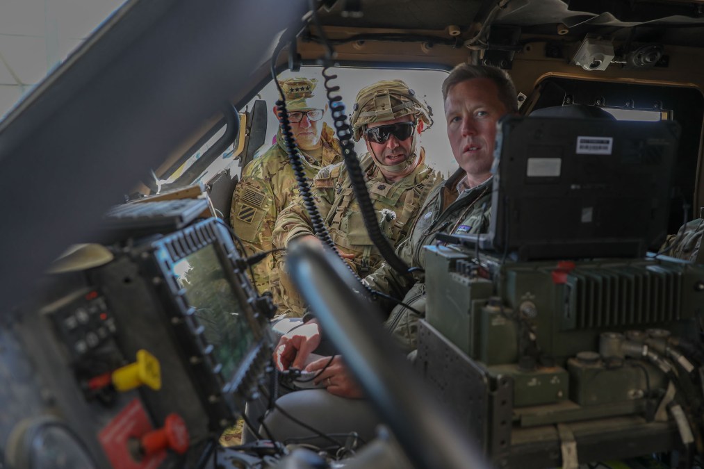 The Secretary of the Army, Daniel Driscoll, looks at Next Generation Command and Control (NGC2) equipment during a visit to Project Convergence - Capstone 5 at Fort Irwin, Calif., in March 2025. (U.S. Army photo by Pfc. Janean Carr)