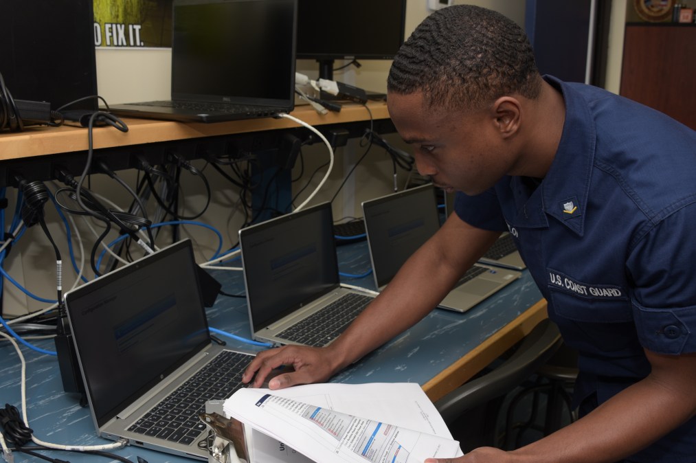 U.S. Coast Guard Petty Officer 3rd Class Carl Taylor, an information systems technician assigned to Electronics Support Detachment Mayport, Florida, reimages newly assigned laptops delivered to Coast Guard Sector Jacksonville, Florida, April 5, 2022. (U.S. Coast Guard photo by Petty Officer 2nd Class Barry Bena)