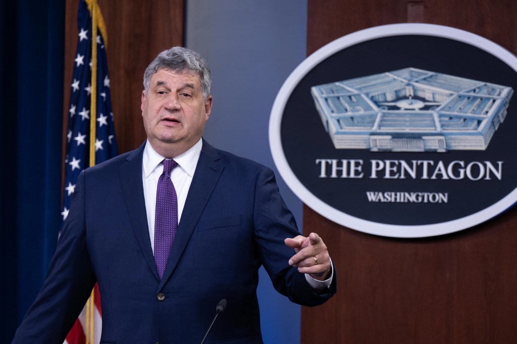 Under Secretary of Defense for Acquisition and Sustainment William LaPlante holds a press brief at the Pentagon, May 6, 2022. (DoD Photo by U.S. Navy Petty Officer 2nd Class James K. Lee)