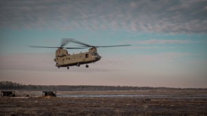 A CH-47 Chinook helicopter from the 101st Airborne Division (Air Assault) arrives at the Millington-Memphis Airport to conduct refueling and resupply on January 13, 2024, during a Large-Scale Long-Range Air Assault into the Joint Readiness Training Center on Fort Johnson, LA. (Photo by Sgt. 1st Class Joseph Truesdale)