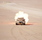 An M1A2 Abrams tanks assigned to 1st Battalion, 66th Armor Regiment, 3rd Armored Brigade Combat Team, 4th Infantry Division, fires a 120mm Sabot tank round at a target during Gunnery Live Fire Qualifications at the Udairi Range Complex, Kuwait, April 26, 2015. (U.S. Army photo by Capt. Shaun Manley, 3rd ABCT, 4th Inf. Div., Public Affairs Officer)