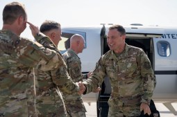 U.S. Air Force Chief Master Sgt. Raun Howell, 6th ARW command chief, second from left, shakes hands with Gen. Johnny Lamontagne, Air Mobility Command commander, at MacDill Air Force Base, Florida, June 9, 2025. Lamontagne arrived to attend CORONA South 2025, a conference held bi-annually that allows Air Force leaders to discuss strategy and policy. (U.S. Air Force photo by Senior Airman Derrick Bole)