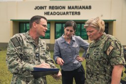 U.S. Navy Capt. Alan Eichelman (left), commander, Naval Facilities Engineering Systems Command (NAVFAC) Marianas, briefs U.S. Navy Rear Adm. Heidi Berg (right), deputy commander, U.S. Fleet Cyber Command / Navy Space Command, on key infrastructure locations prior to an aerial tour of Guam, July 23, 2025. (U.S. Navy photo by William J. Busby III)