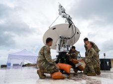 Airmen assigned to the 138th Electromagnetic Warfare Squadron, Colorado Air National Guard, perform maintenance on a high mobility antenna during Resolute Space 2025 at Andersen Air Force Base, Guam, July 12, 2025. (U.S. Air Force photo by Senior Airman Jade M. Caldwell)