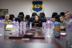 From center, Schuyler Moore, U.S. Central Command chief technology officer, speaks with Task Force 99 at Ali Al Salem Air Base, Kuwait, Nov. 21, 2022. (U.S. Air Force photo by Staff Sgt. Ashley N. Mikaio)