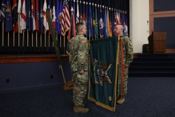 FORT BELVOIR, Va. – Lt. Col. Christopher Telley, commander, 1st Information Operations Battalion, and 1st Sgt. Heinz Cooke, the battalion’s senior enlisted leader, case the battalion colors at an inactivation ceremony here in the Thurman Auditorium at Humphrey Hall, May 8, 2025. (Photo by Steven Stover)