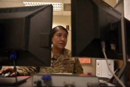 Tech. Sgt. Alejandra Martinez, 379th Air Expeditionary Wing security manager and executive administration non-commissioned officer-in-charge, reviews policies and procedures at her workstation at Al Udeid Air Base, Qatar on Oct. 18, 2019. National Cybersecurity Awareness Month, observed in October, is intended to raise awareness about the importance of cybersecurity. (U.S. Air Force photo by Tech. Sgt. John Wilkes)