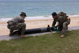 U.S. Marine Corps Staff Sgt. Daniel Torres and Staff Sgt. Maxwell Carlson place an Unmanned Underwater Vehicle on level ground during a UUV Recovery rehearsal for exercise Kaiju Rain on Kin Blue, Okinawa, Japan, April 17, 2025. (U.S. Marine Corps photo by Cpl. Kira Ducato)