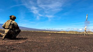 A Soldier of the 25th Infantry Division fires a Switchblade 600 rocket from the Loitering Unmanned Systems Directed Requirement (LUS DR) system during a new equipment training at the Pohakuloa Training Area in Hilo, HI. (U.S. Army photo by SPC Antonio Deric, 25th Infantry Division)